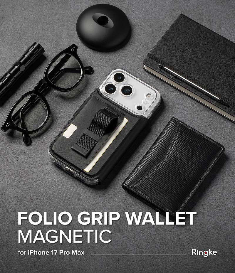 - Ringke Folio Grip Wallet Magnetic là sản phẩm tích hợp 2 tính năng trong một: ví đựng thẻ kiêm giá đỡ và cần được dùng chung với ốp lưng Magnetic dành riêng cho dòng máy iPhone 17 Pro Max.