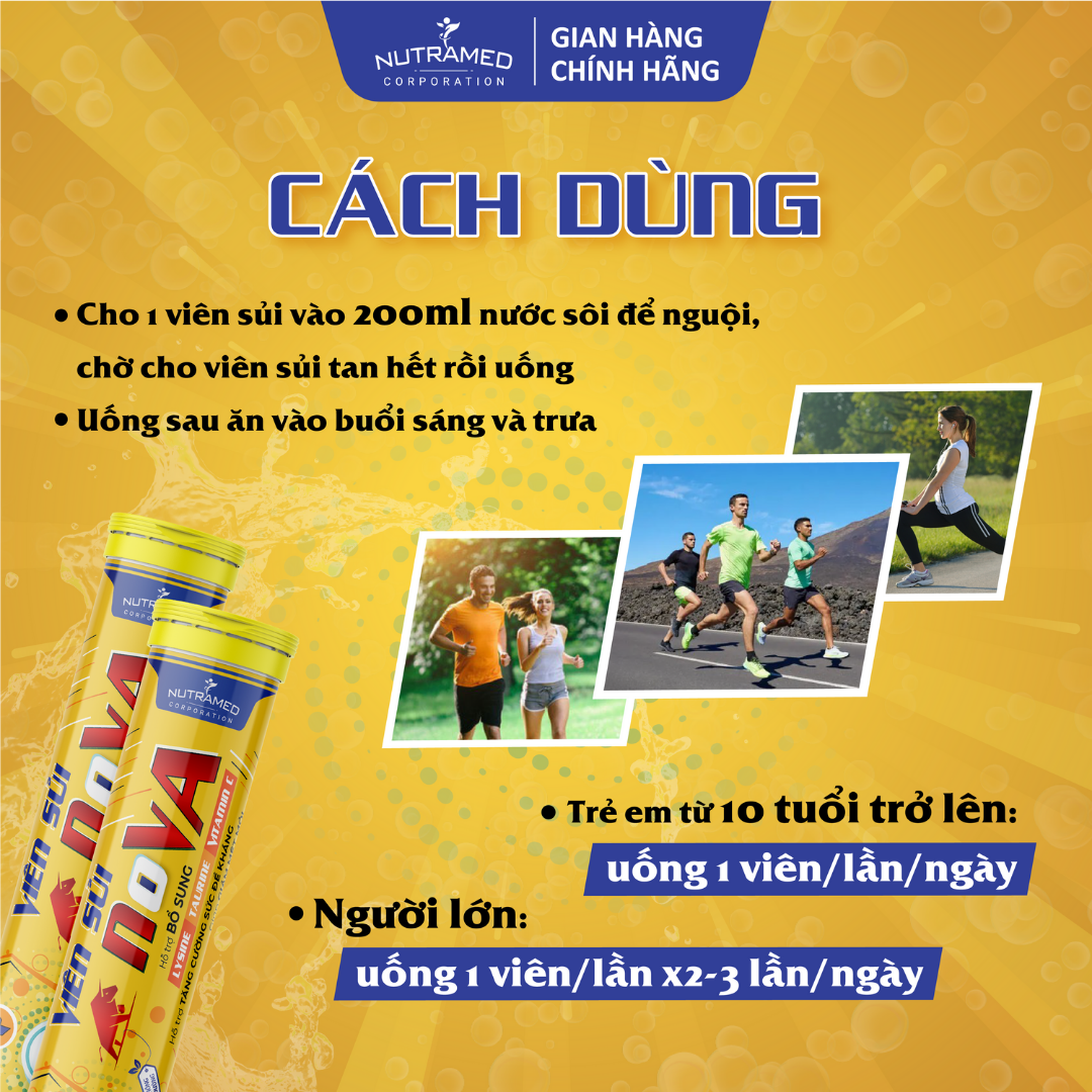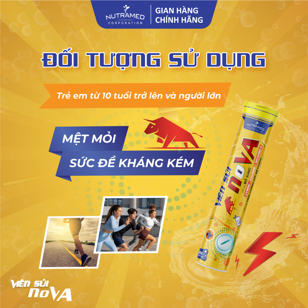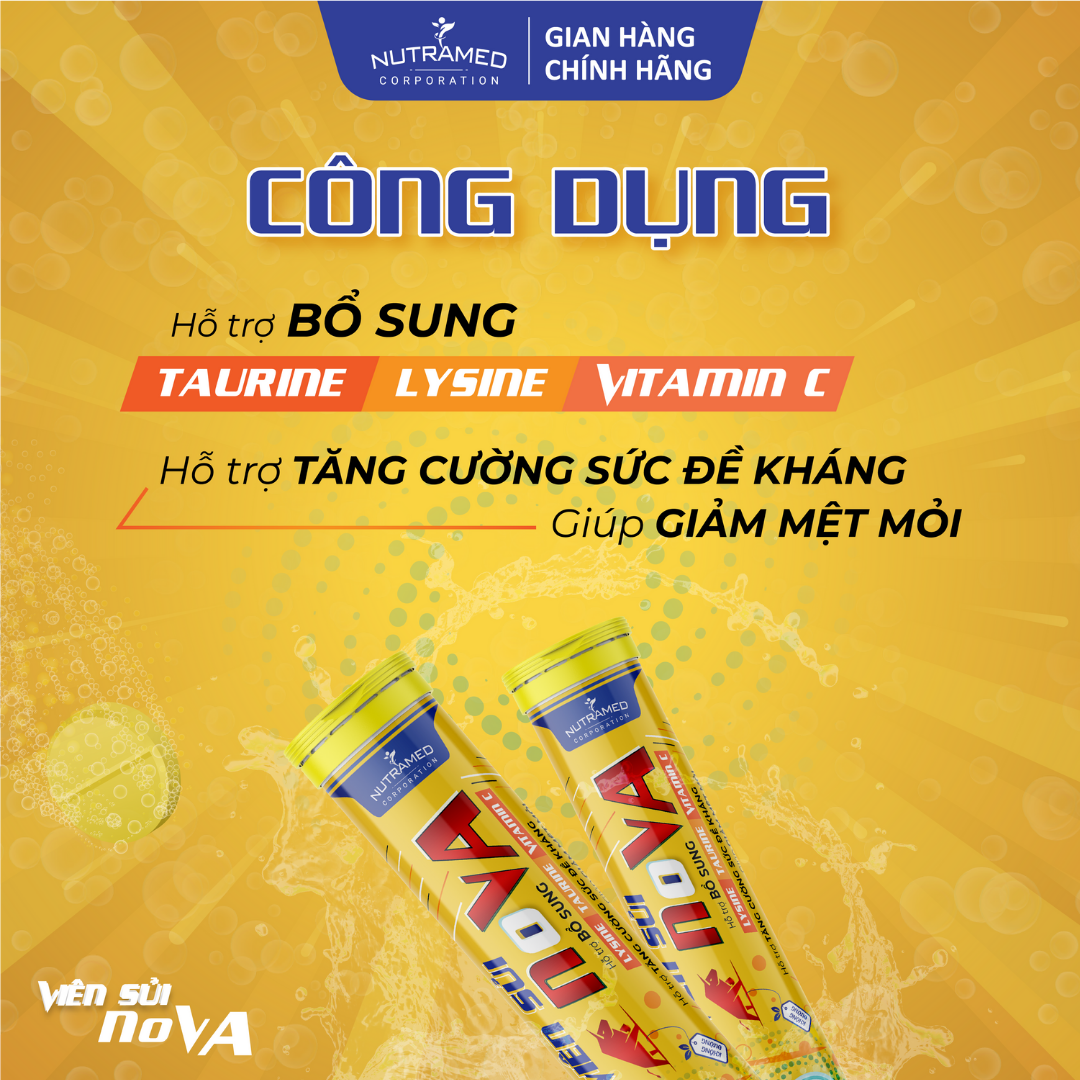 VIÊN SỦI N.O.V.A - Giải pháp hỗ trợ tăng cường sức đề kháng, giảm căng thẳng, mệt mỏi. THÀNH PHẦN ️Taurine; Vitamin C (Acid L-ascorbic); Lysine hydrochloride, Caffeine; Vitamin B3 (Nicotinamide); Vitamin B1 (Thiamin
