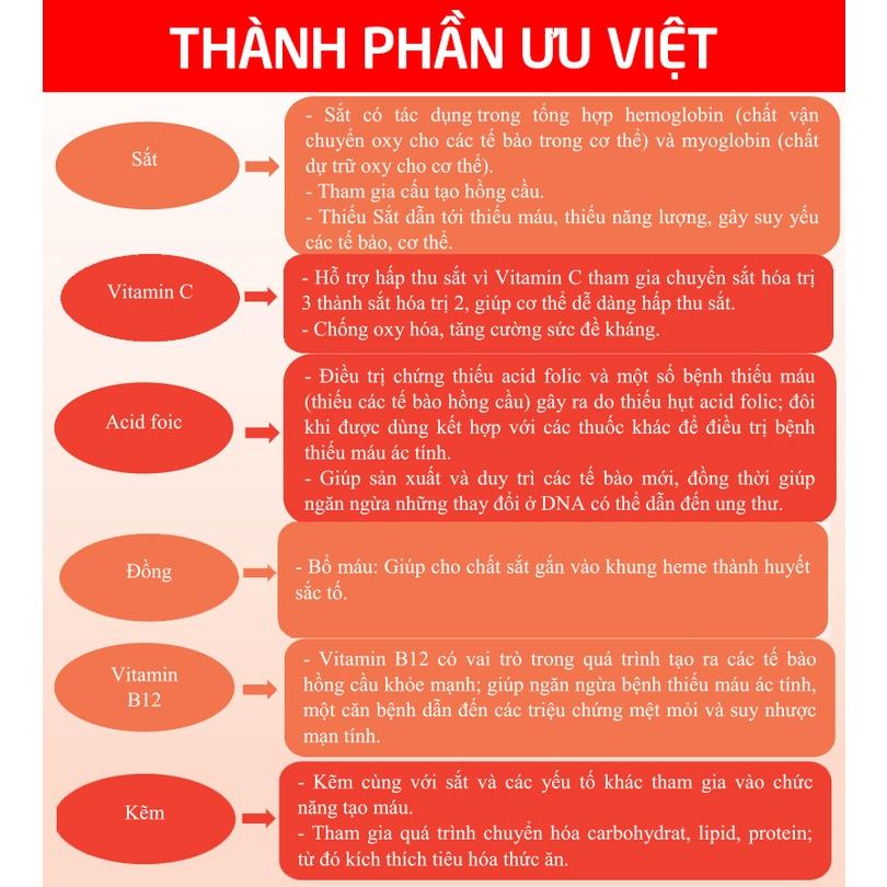 1. THÀNH PHẦN : Fe Fumarat 79mg Acid folic 160mcg Vitamin B12 5 mcg 2. CÔNG DỤNG Bổ xung sắt cho người thiếu máu ,cung cấp nano ở dạng hữu cơ có sinh