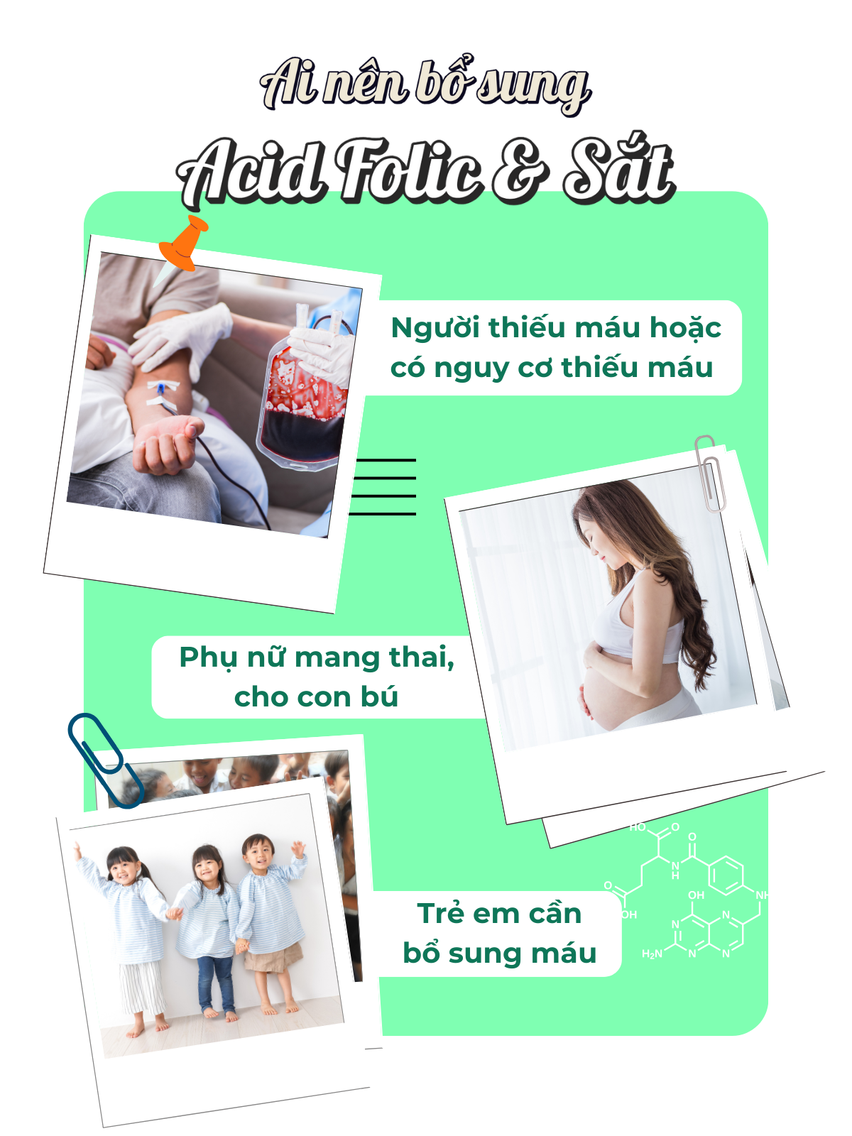 - Giúp đẹp da, chống mệt mỏi, tăng cường đề kháng ĐỐI TƯỢNG SỬ DỤNG CỦA VIÊN UỐNG ACID FOLIC & SẮT: Người thiếu máu có nguy cơ thiếu máu như: sau phẫu thuật, chấn thương, người hiến máu, phụ nữ mang thai, cho con bú, trẻ em, tuổi dậy thì, phụ nữ trong thời kỳ kinh nguyệt. QUY CÁCH & HDSD SẢN PHẨM: