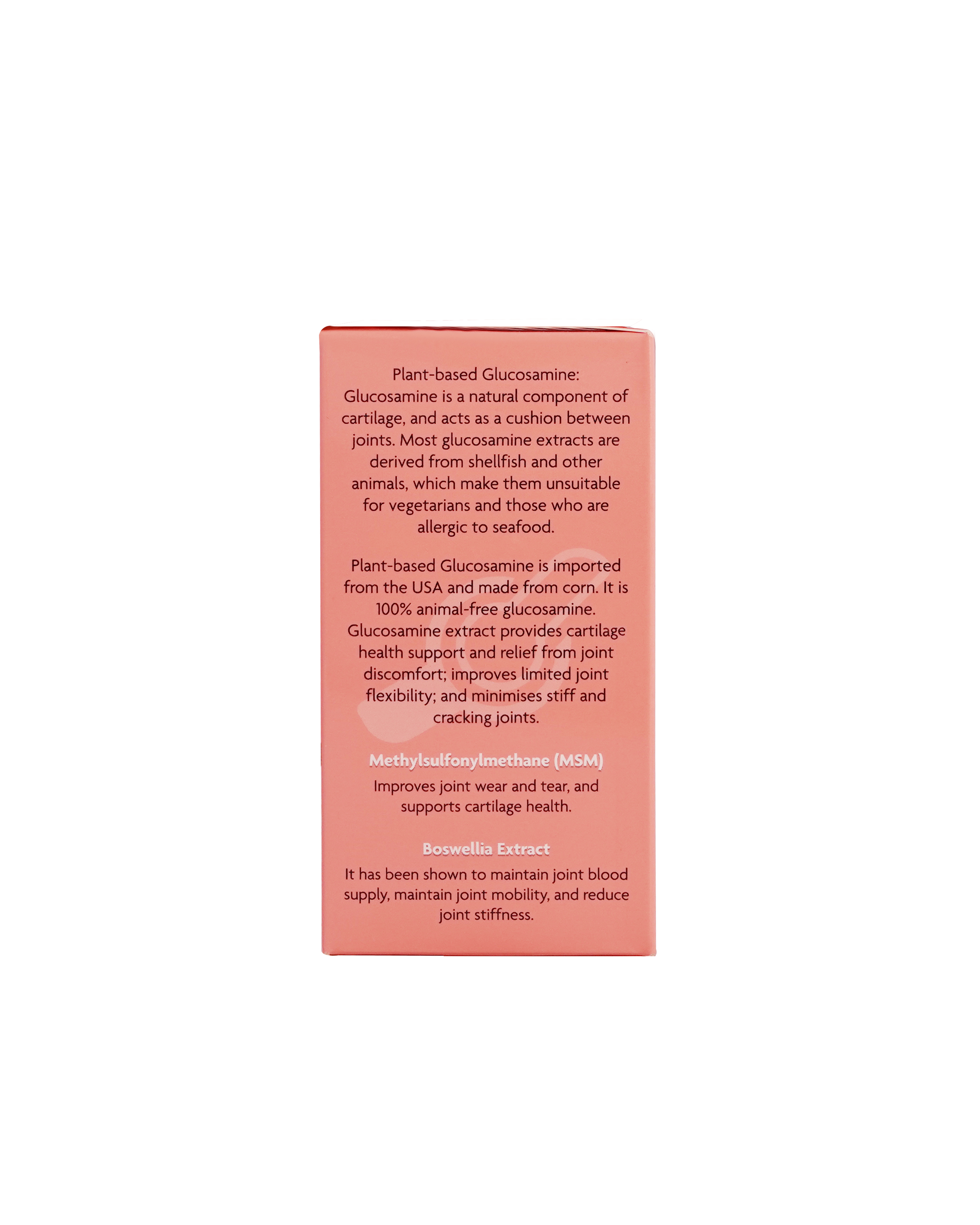Glucosamine nguồn gốc thực vật (400mg): Glucosamine là một phần của sụn và đóng vai trò như một lớp đệm giữa các khớp xương. Hầu hết glucosamine có nguồn gốc từ động vật hoặc động vật có vỏ, vì thế glucosamine này không phù hợp với người ăn chay hoặc những người dị ứng với hải sản. Thay vào đó, glucosamine nguồn gốc thực vật của chúng tôi được làm từ ngô nhập khẩu Hoa Kỳ. Đây là một glucosamine 100% thuần chay, không có nguồn gốc động vật, giúp hỗ trợ sức khỏe sụn; giúp hỗ trợ giảm khó chịu ở khớp, hạn chế chuyển động khớp và nứt khớp,