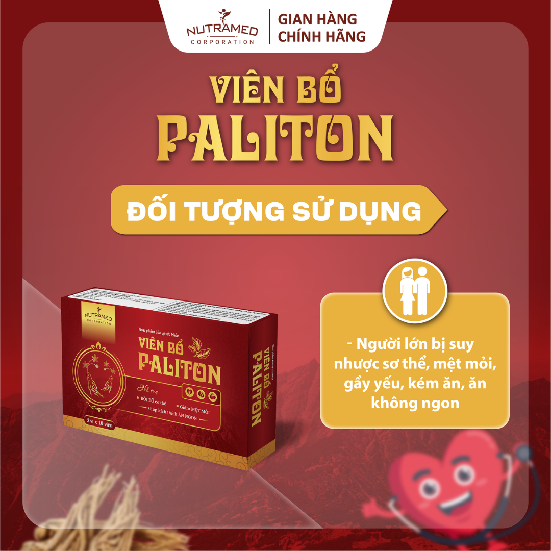 VIÊN BỔ PALITON - Hỗ trợ bồi bổ cơ thể, giảm mệt mỏi, k.í.c.h t.h.í.c.h ăn ngon THÀNH PHẦN ️Đương quy (Radix Angelicae sinensis). Thục địa (Radix Rehmanniae glutinosae praeprata). Bạch thược (Radix Paeoniae