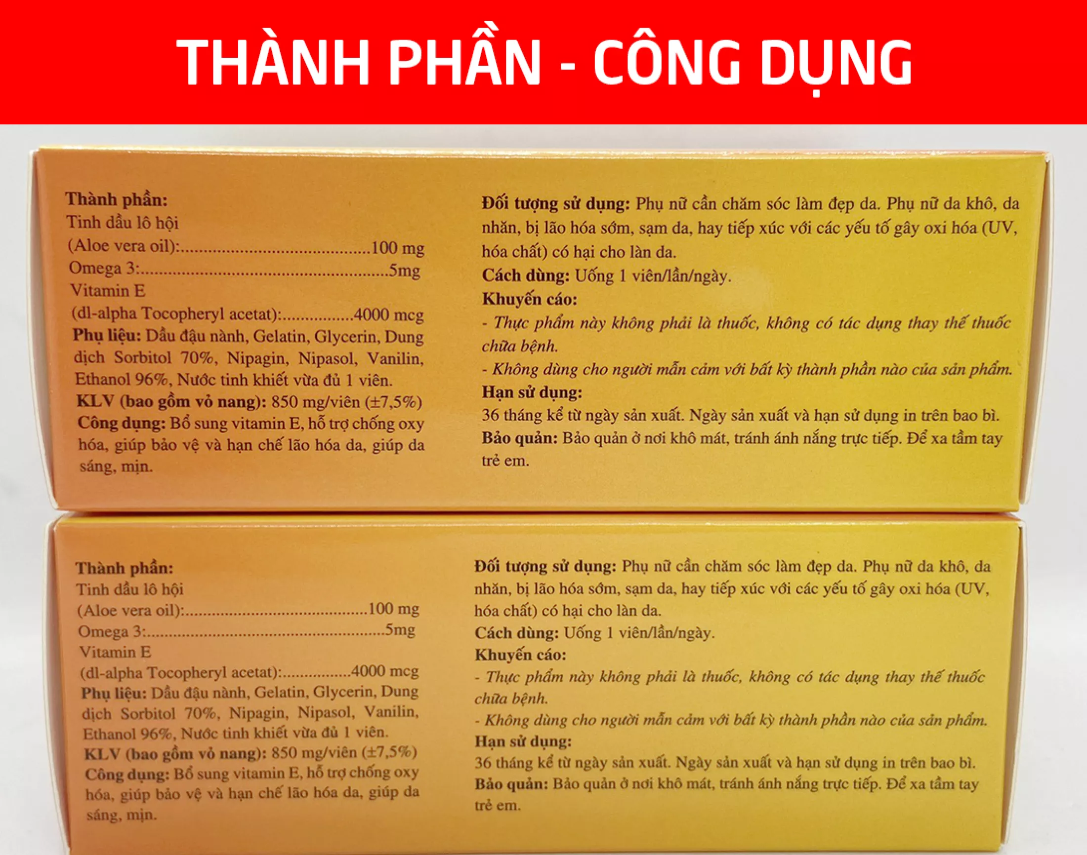 THÀNH PHẦN VITAMIN E ROSTEX Vitamin E : 4000mcg Omega 3: 5mg Tinh dầu Lô hội : 10mg Phụ liệu: Dầu đậu nành, Gelatin, Glycerin, Dung dịch Sorbitol 70%, Vanilin, Nipagin, Napisol, Ethanol 96%, Nước