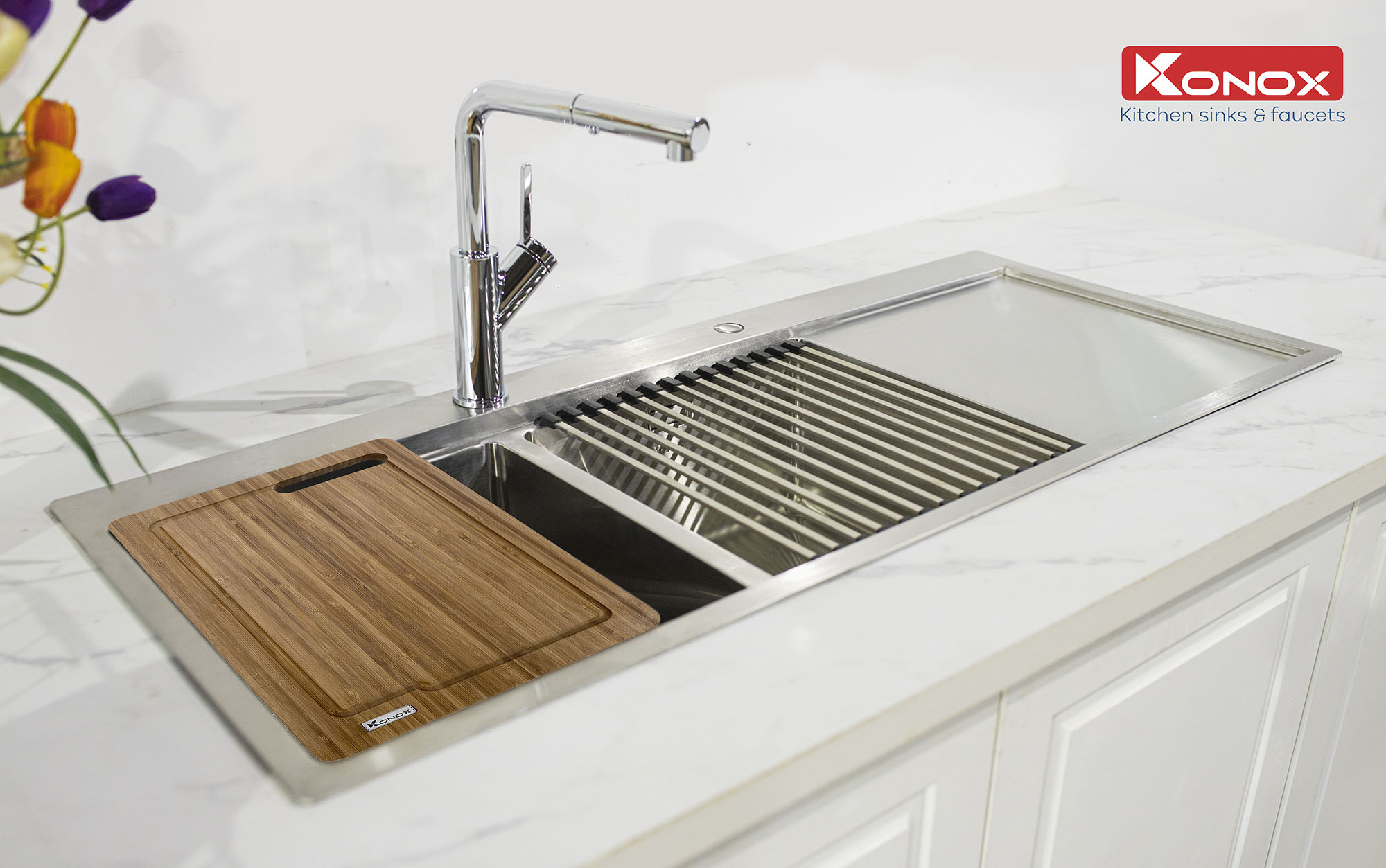 - Thiết kế đặc biệt với 1 đường nước vào và 2 đường nước ra (với 2 van nước riêng biệt) - Phù hợp với các chậu rửa chén bát 2 hộc (2 ngăn), chỉ