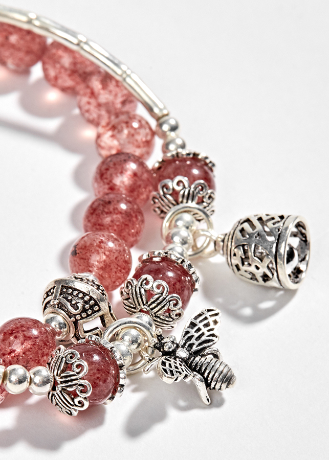 ✨Vòng 2 Line Thạch Anh Dâu Phối Charm Ong Bạc (6mm)