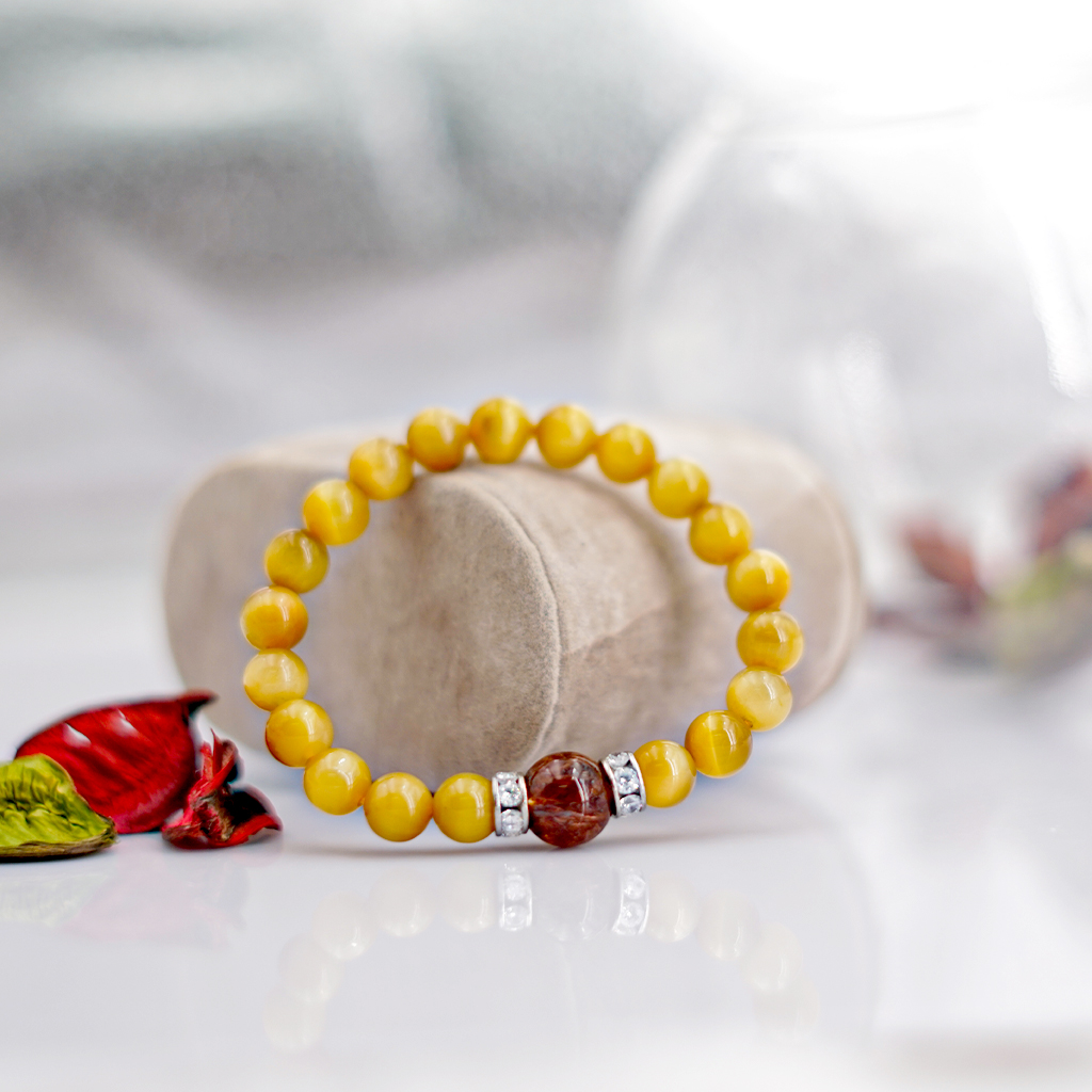 Vòng tay phongg thủy Mắt hổ vàng tâm 8mm + Thạch Anh Tóc nâu by Anqlo là sản phẩm được chế tác tinh xảo, có độ hoàn thiện cao bởi các nghệ nhân lâu năm