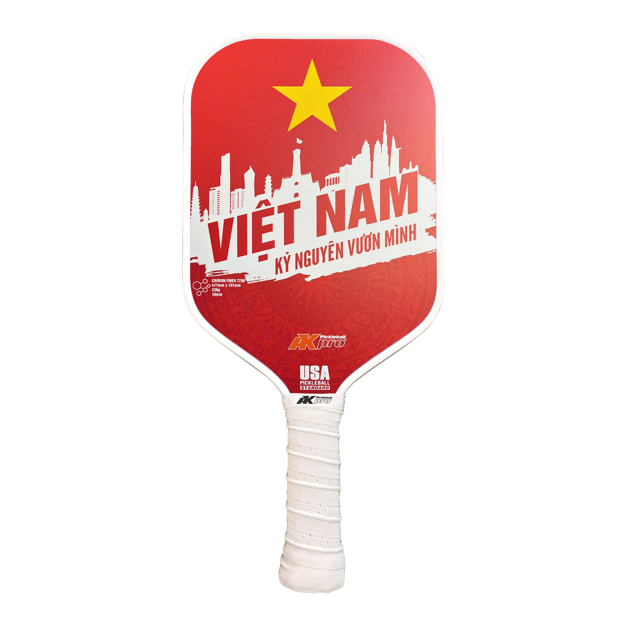 Màu sắc: Xám - Đỏ - Dài: 415 mm - Rộng: 195 mm - Độ dày: 16mm. - Trọng lượng: 235g - Cấu tạo: Lõi tổ ong, mặt carbon T700. - Vợt Pickleball T700 Pro được sản xuất theo tiêu chuẩn USSA Mặt vợt carbon T700 Pro 16mm - Phù hợp lối chơi kiểm soát bóng. Nên dùng đối với những người có lối đánh cân bằng, kết hợp
