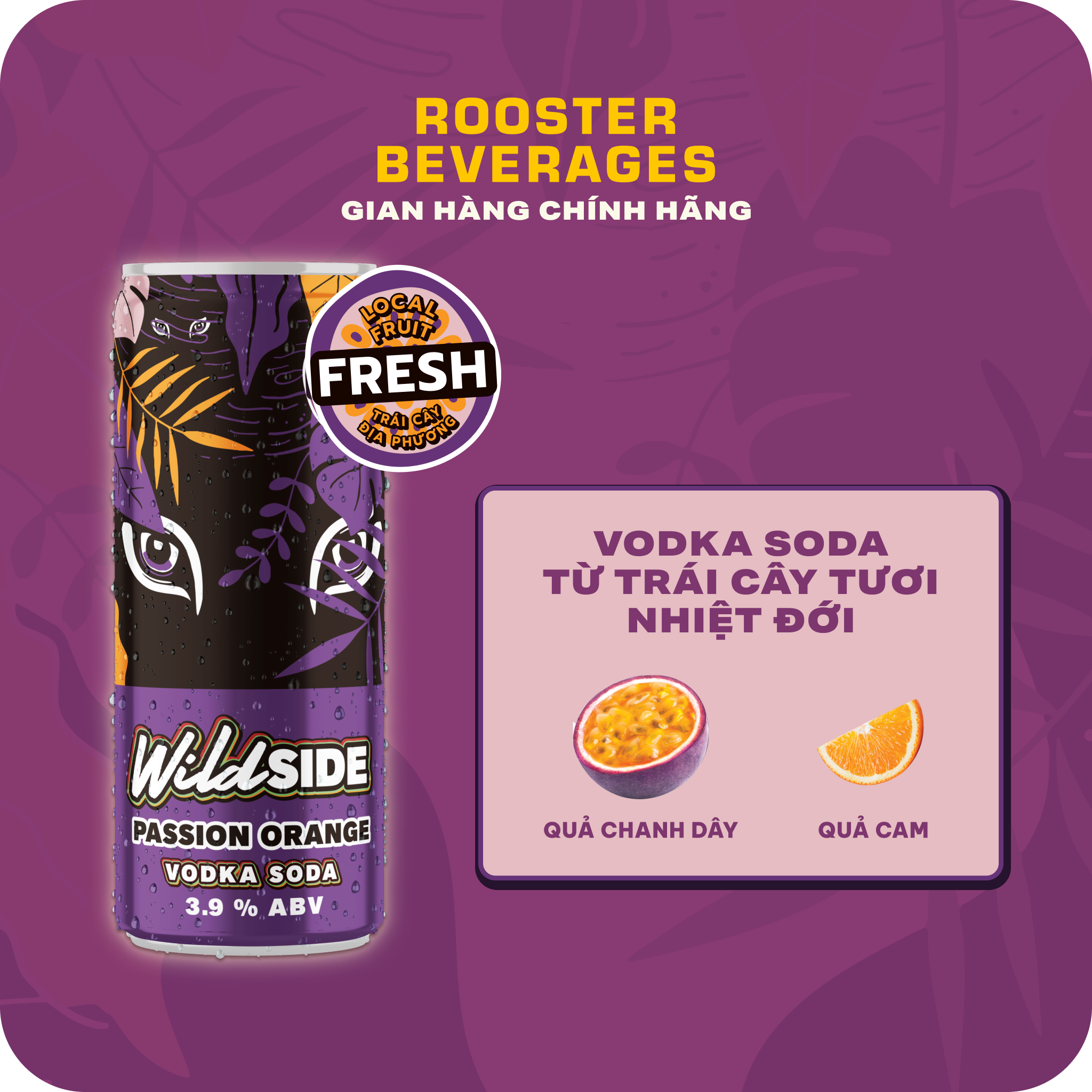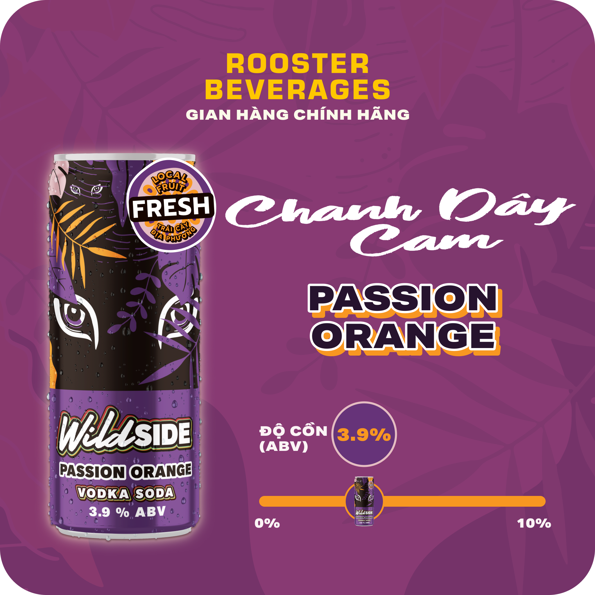 WILDSIDE VODKA SODA VỊ CHANH DÂY CAM (PASSION ORANGE) - ĐỘ CỒN 3.9% - Vị tươi mát của cam và vị chua ngọt từ chanh dây - Độ cồn nhẹ 3.9% -------------- TROPICAL FLAVORS VODKA