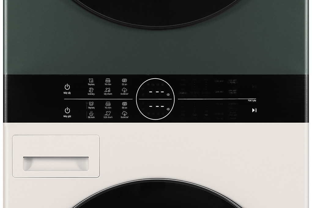 - Ứng dụng LG ThinQ giúp bạn dễ dàng kết nối và kiểm soát với máy giặt. Tháp giặt sấy LG WashTower Giặt 25kg/Sấy 17kg xanh/be - WT2517NHEG • Bộ điều khiển Trung tâm • AI DD / Smart Pairing • TurboWash 360 / Sấy khô Sẵn sàng • Chăm sóc dị ứng Allergy Care • Dual Inverter HeatPump THÔNG SỐ KỸ THUẬT Loại máy giặt: Tháp giặt sấy Lồng giặt: Lồng ngang Khối lượng giặt: Giặt 25 Kg - Sấy 17 Kg Số người sử dụng: Trên 7 người (Trên 10 kg) Kiểu động cơ: Lồng giặt: truyền động trực tiếp - Lồng sấy: truyền động dây curoa Tốc độ quay vắt tối đa: 1400 vòng/phút Chất liệu lồng giặt: Thép không gỉ Chất liệu vỏ máy: Kim loại sơn tĩnh điện Chất liệu cửa máy: Kính Sản xuất tại: Hàn Quốc Dòng sản phẩm: 2023 Thời gian bảo hành động cơ: 10 năm Mức tiêu thụ điện năng Hiệu suất sử dụng điện: Hãng không công bố Loại Inverter: Dual Inverter Công nghệ giặt Chương trình: Đồ len Turbowash Đồ cotton Giặt hơi nước Diệt khuẩn Chống nhăn Chăn mền Chu trình tải về Công nghệ giặt: Công nghệ TurboWash360 Công nghệ AI DD bảo vệ sợi vải Chm sóc dị ứng Allergy Care Công nghệ máy nén bơm nhiệt Inverter sấy khô, hạn chế hư hỏng sợi vải Công nghệ sấy: Bơm nhiệt Bảng điều khiển và Tiện ích Bảng điều khiển: Tiếng Việt cảm ứng có màn hình hiển thị Tiện ích: Khóa trẻ em Chức năng chẩn đoán thông minh Smart Paring Tự động xác định chu trình giặt sấy Bình ngưng tự động làm sạch Cho phép điều khiển máy giặt từ xa qua ứng dụng LG ThinQ Thông tin lắp đặt Kích thước - Khối lượng: Cao 188.5 cm - Ngang 68.3 cm - Sâu 81.5 cm - Nặng 160 kg Chiều dài ống cấp nước: 142 cm Chiều dài ống thoát nước: 276 cm Hãng: LG. Tính năng đặc biệt của sản phẩm Tháp giặt sấy LG Inverter WT2517NHEG là dòng sản phẩm đầu tiên tích hợp giữa máy giặt (phía dưới) và máy sấy quần áo (phía trên) của hãng LG, mang lại cho bạn sự trải nghiệm sản phẩm độc đáo về phong cách thiết kế. Hơn nữa, sản phẩm còn cho phép bạn giặt và sấy quần áo với khối lượng lớn cùng một lúc tiện lợi. *Hình ảnh chỉ mang tính chất minh họa Thiết kế