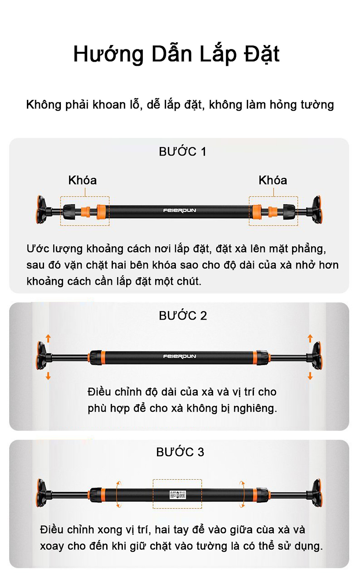 - Bạn phải đo khoảng không lắp xà phải lớn hơn kích thước tối thiểu của xà đơn và nhỏ hơn kích thước tối đa của xà đơn, để chọn kích thước xà đơn cho phù hợp Ví dụ: Xà đơn đơn có độ dài 90-115cm thì bạn phải đo độ rộng khoảng không lắp xà đơn đẹp nhất từ 95cm - 110cm. Sau đó bạn có thể xoay 2 đầu xà đơn tăng chỉnh độ dài cho phù hợp rồi khóa chốt lại.
