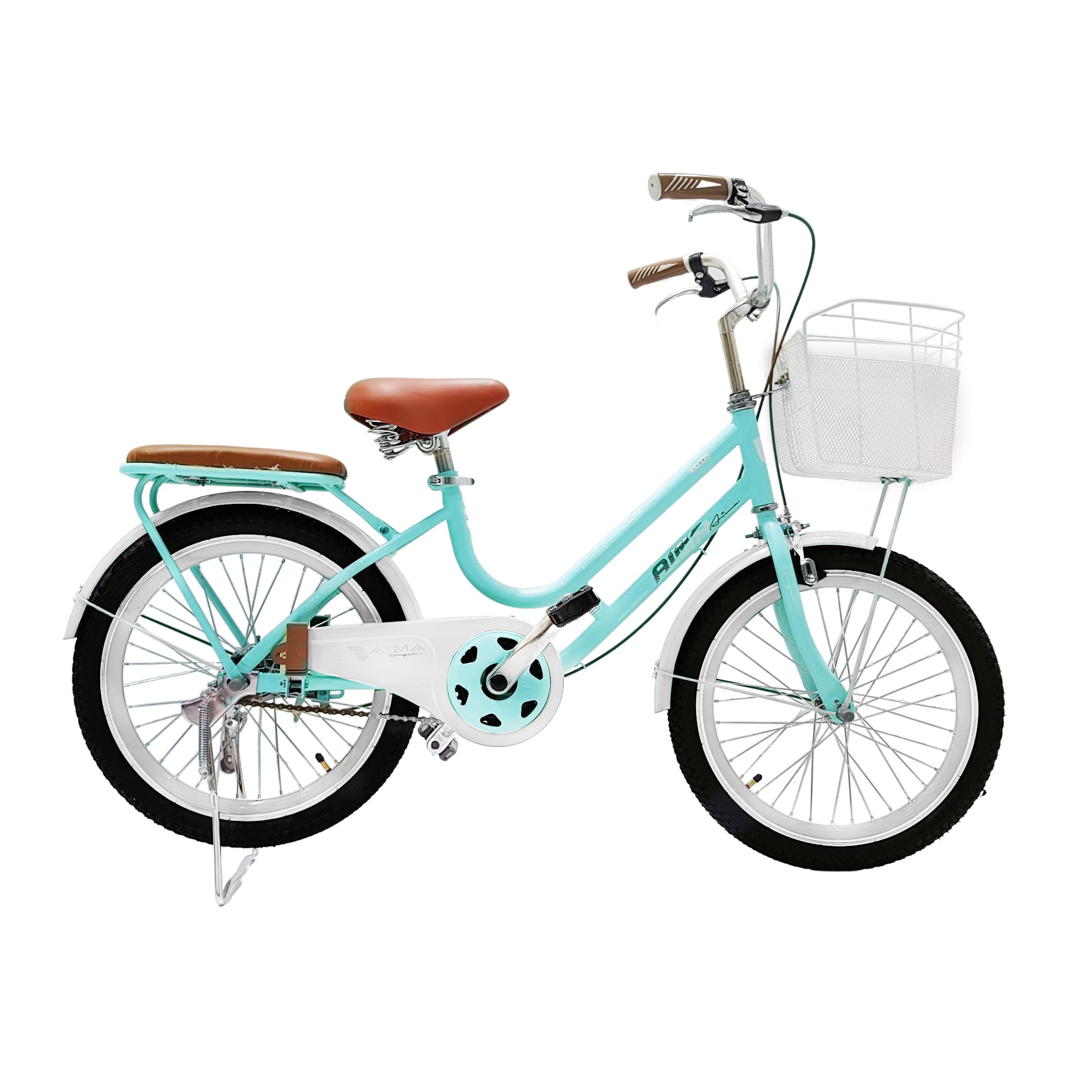 Xe đạp trẻ em Aima Angel 20 được trang bị đầy đủ phụ kiện đi cùng xe: Giỏ xe màu trắng chắc chắn. Baga có thêm đệm yên đồng bộ với yên trước.