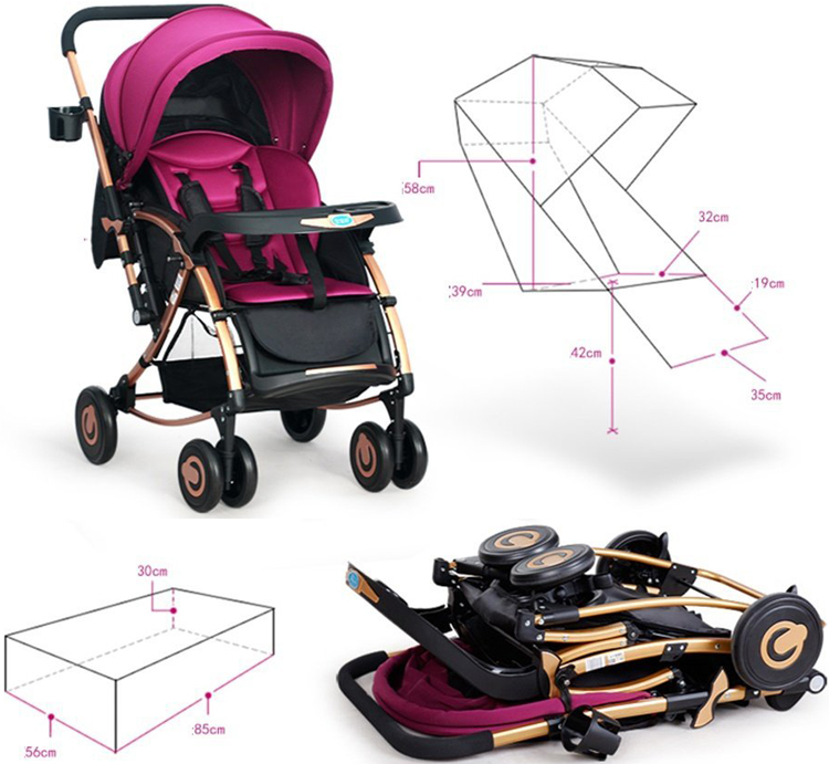 Xe được thiết kế là xe đẩy siêu nhẹ và gọn. Có thêm mái che ở bên trên.