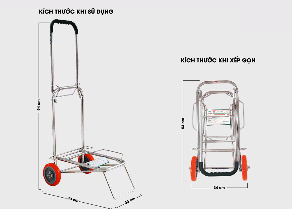 THÔNG TIN SẢN PHẨM XE ĐẨY XẾP GỌN TRỌNG TẢI 50KG. - Model (màu sắc): TS.XD-1 (Inox) - Kích thước sử dụng: 43 x 33 x Cao 94 (cm) - Kích thước xếp gọn: 54 x