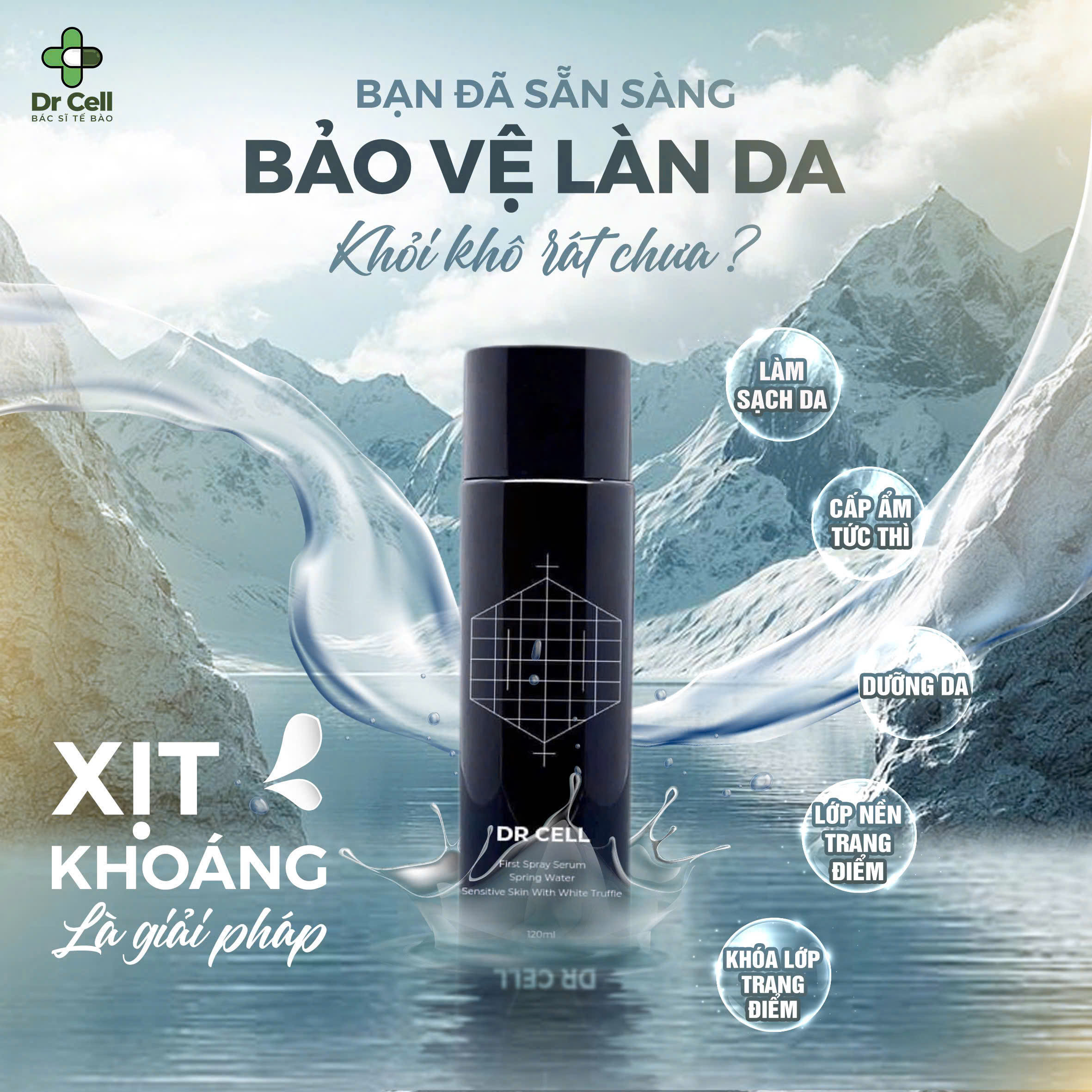 Xịt khoáng tế bào gốc Dr Cell - 120ml Serum khoáng chất Dr Cell với độ tinh khiết & đặc tính làm dịu mang cảm giác tươi mát, dễ chịu, dịu nhẹ da ngay tức thì. Dùng sau thủ thuật da liễu hay can thiệp thẩm mỹ, da bị đỏ, bỏng nắng, hăm tã,.. Hoặc dùng sau tẩy trang, sau cạo râu, sau khi chơi thể thao, sau tẩy lông... THÀNH PHẦN: Earth Marine Water, Willow Bark Extract, Selenium, ZinC, PDRN Sodium DNA, Betaine, Panthenol. Ngoài thành phần chính là nước khoáng, xịt khoáng Tế Bào Gốc Dr Cell còn có thêm sự kết hợp độc đáo giữa các khoáng chất và nguyên tố vi lượng như Selenium, Zinc, có tác dụng làm dịu da, giảm tình trạng đỏ rát khó chịu và chống oxy hoá. PDRN Sodium DNA tế bào gốc cá hồi có độ tương thích với DNA của người lên tới 95%, có tác dụng thúc đẩy tái tạo tế bào làn da bị tổn thương, giúp tăng sinh collagen và elastin, làm tăng độ đàn hồi và dưỡng da sáng hồng căng bóng tự nhiên. Betaine : Có tác dụng thúc đẩy tái tạo cấu trúc da, ngăn ngừa hình thành nếp nhăn, giữ nước cho làn da và củng cố hàng rào bảo vệ da. Panthenol : Giúp làm mềm, làm dịu da. CÁCH SỬ DỤNG: - Giữ vòi xịt cách mặt khoảng 20cm, nhấn giữ