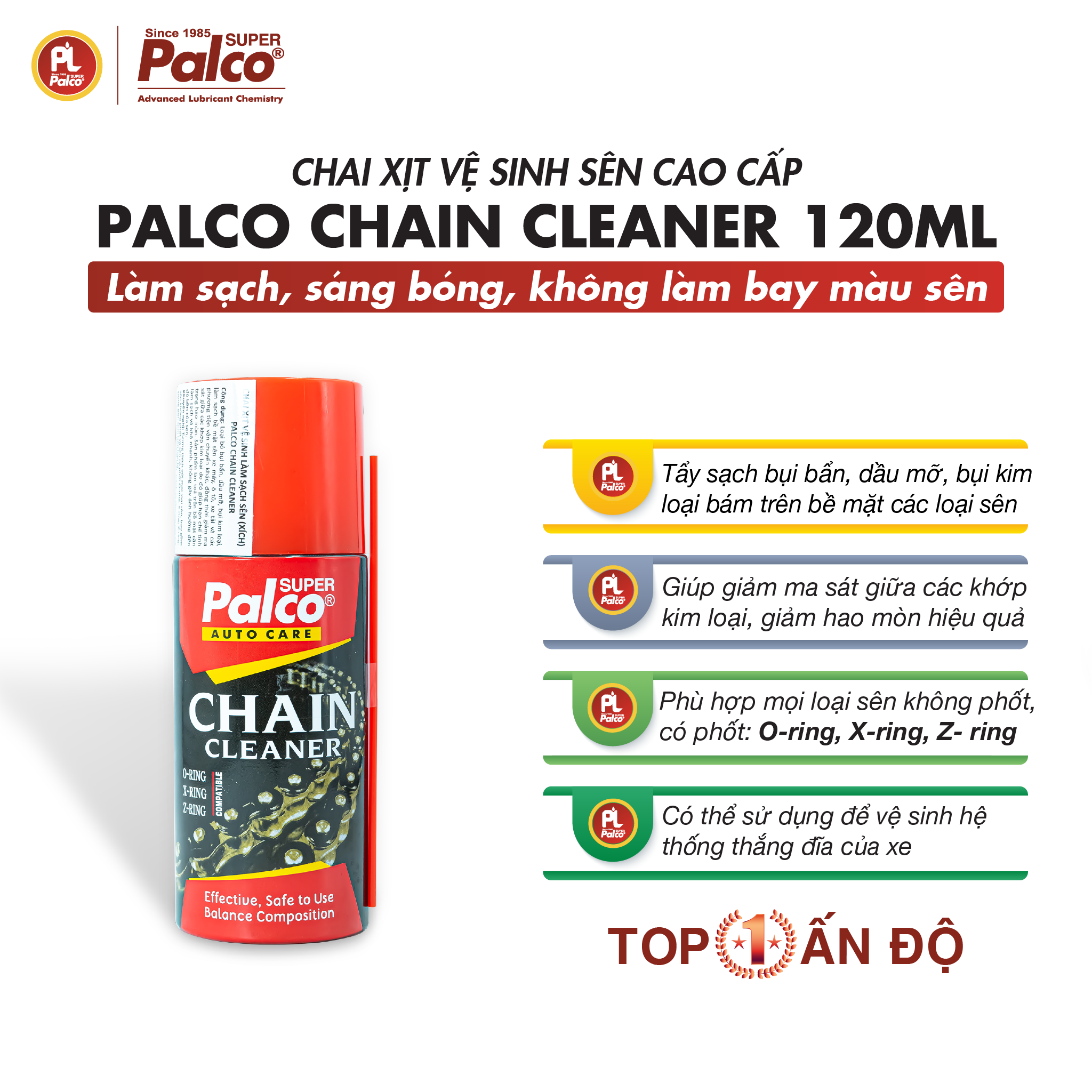 Sử dụng xịt vệ sinh sên lại định kỳ thường xuyên để đảm bảo sên luôn được sạch sẽ, giúp bảo dưỡng và kéo dài thời gian sử dụng của sên ĐÓNG GÓI: Chai xịt 120 ml CẢNH BÁO & BẢO QUẢN: Lưu trữ ở nơi thoáng mát, không để trong môi trường quá 50 độ C. Tránh xa nguồn lửa. Để ngoài tầm với của trẻ em. VỀ THƯƠNG HIỆU PALCO Paras Lubricants được thành lập năm 1985 với trụ sở chính tại Mumbai, 1 văn phòng đại diện ở Tây Ấn và 2 nhà máy hiện đại đặt tại Khopoli và Daman. Đây là tập đoàn đã hoạt động 38 năm trên thị trường mỡ bò, dầu nhớt và sản phẩm chăm sóc xe với 2 thương hiệu chính, gồm: • PALCO Lubricants: chuyên về dầu nhớt và mỡ bôi trơn • PALCO Auto care: chuyên về sản phẩm chăm sóc xe Ngoài ra, tập đoàn còn hoạt động trong lĩnh vực thương mại với thương hiệu PALCO EXIM và GREENOIL. PALCO đạt tiêu chí quản trị sản xuất ISO 9001:2005 và tiêu chuẩn chất lượng sản phẩm quốc tế JASO và API. Sản phẩm PALCO rất nổi tiếng tại thị trường Ấn Độ về chất lượng. Đây là nhãn hiệu hàng đầu và được nhiều doanh nghiệp lớn sử dụng như: hãng hàng không Air India, Không quân India Air Force, hãng vận tải Container Corporation India, doanh nghiệp đường sắt Indian Railways, doanh nghiệp khai thác than Coal India, hiệp hội nông nghiệp Ấn Độ, Viện kỹ thuật quốc gia, Bộ quốc phò Thị trường xuất khẩu: Châu Úc, Mỹ Latin, Châu Phi và Việt Nam do SONAIMEX độc quyền phân phối.