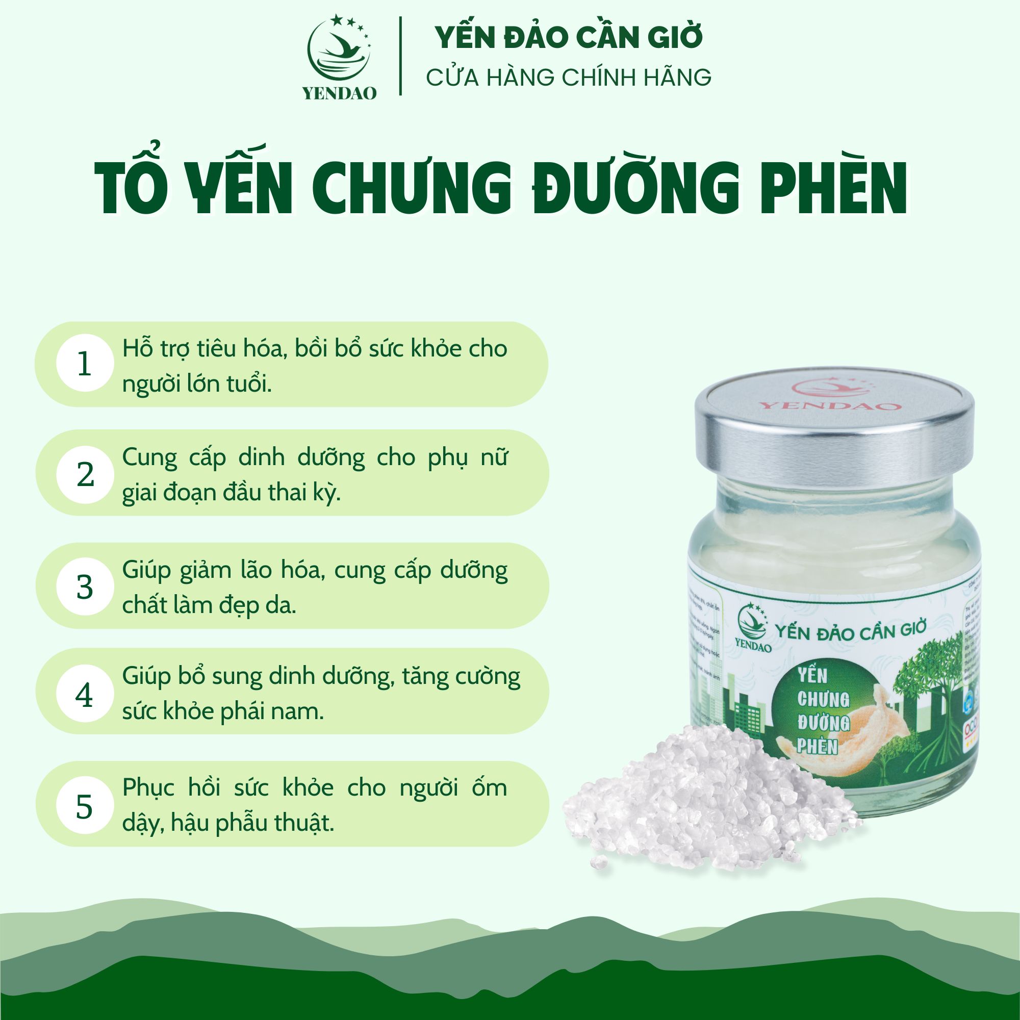 - Mô tả: Yến Hũ Chưng Đường Phèn được chưng từ Tổ Yến xanh sạch Cần Giờ, giàu dinh dưỡng, hỗ trợ bồi bổ sức khỏe, phù hợp cho mẹ bầu, mẹ sau sinh. Sản phẩm có hương vị thanh nhẹ, dịu ngọt, dễ sử dụng hàng ngày giúp tăng cường đề kháng, phục hồi sức khỏe hiệu quả. THÔNG TIN SẢN PHẨM