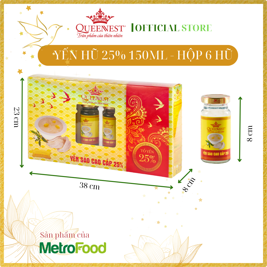 YẾN SÀO CAO CẤP QUEENNEST 25% - 150ML (Hộp 6 Hũ x 150ml) Thành phần: Nước (64.7%), tổ yến thiên nhiên (25%), đường phèn (10%), ngân nhĩ, hương yến tổng hợp, chất ổn định (E331),